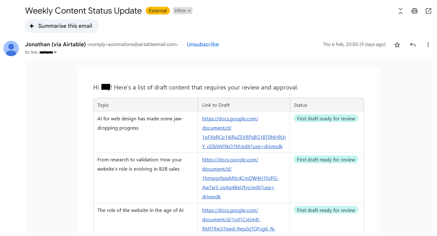 Automating content reporting in Airtable saves time and ensures consistent communication. Whether you use Airtable’s native automation, Zapier, or Make, you can create structured, automated email digests tailored to your team’s needs.